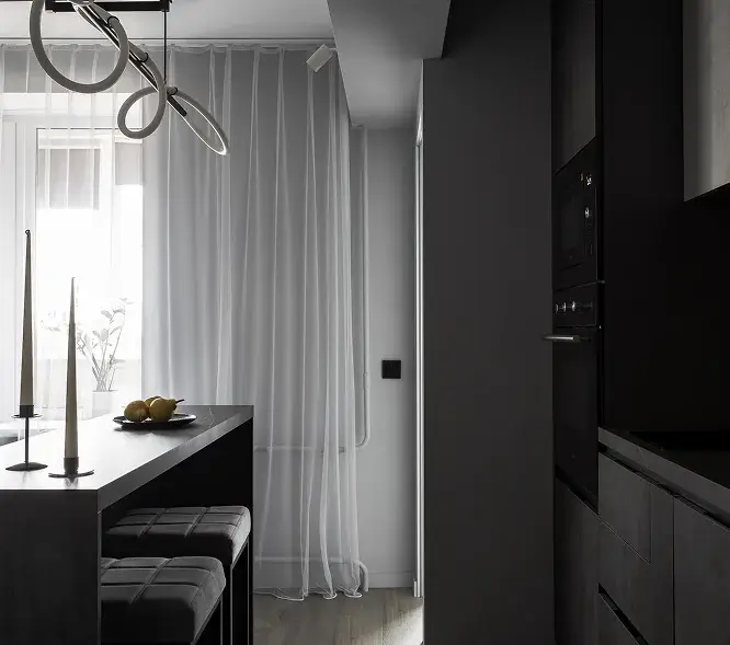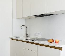 Квартира выполнена в современном стиле с яркими деталями, совмещая в себе элементы хай тека и неоклассики.