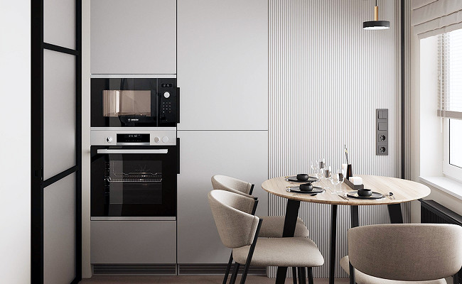 Проект в стиле неоклассики выполнен для молодой пары, которая часто работает удаленно. Эргономикой предусмотрено проживание с собачкой.